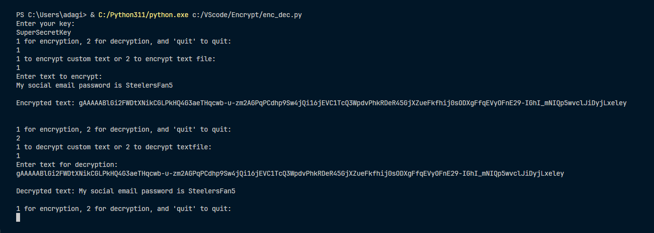 Built a python program to encrypt and decrypt any information you want, with whatever key you want. No keys are stored ever, and the encryption method creates new cipher text for the same text each time its encrypted.